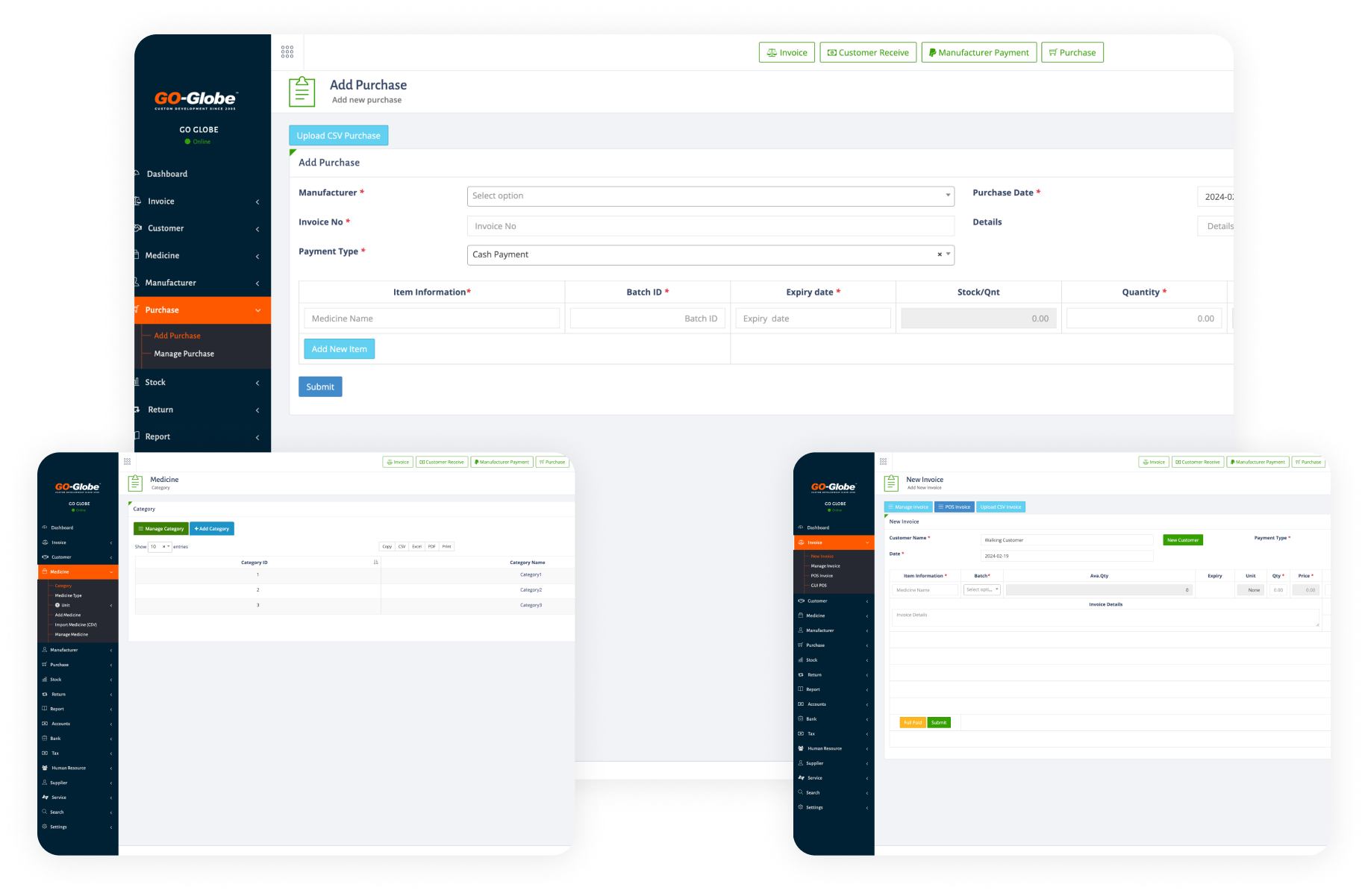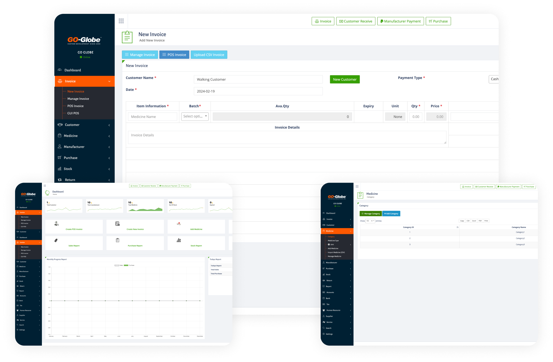 Introducing our Pharmacy Management Software Pro, a holistic solution designed to transform your business operations. Seamlessly integrating sales, inventory, finance, human resources, and customer relations, this software simplify the complexities of pharmacy management. Efficiency and  responsive approach to meet the diverse demands of the pharmaceutical industry. Dashboard, a central hub orchestrating a symphony of essential business functions. Navigate seamlessly through POS Invoices, GUI POS, Customer interactions, and comprehensive Medicine and Manufacturer databases. Effortlessly manage Purchase orders, monitor Stock levels, and process Returns efficiently. Dive into detailed Reports, ensure financial accuracy with Accounts and Bank modules, and streamline tax processes. Elevate your workforce with Human Resource tools, engage Suppliers, and optimize Services. Welcome to a unified business command center!